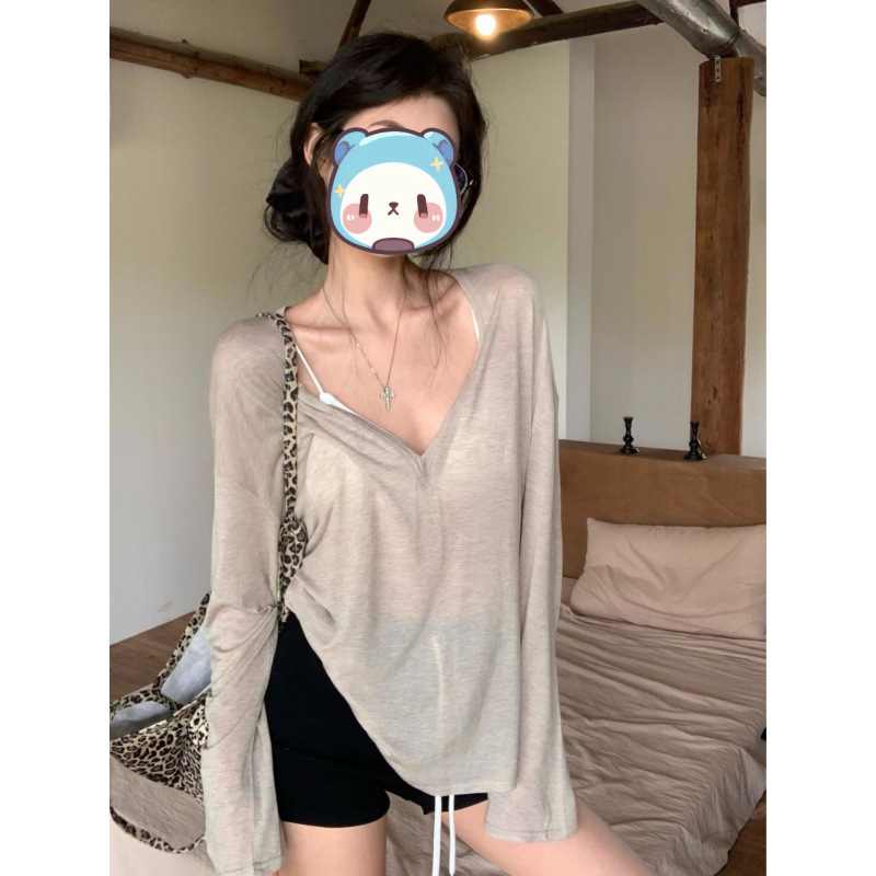白い薄いvネック長袖tシャツ女装夏のゆるい日焼け止めブラウス気質カジュアルシャツ上着