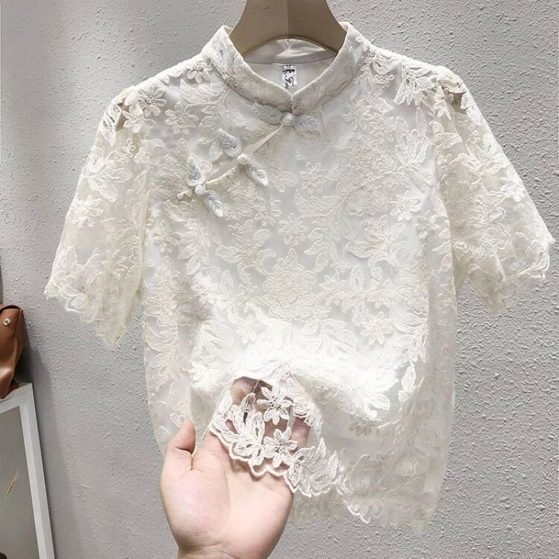 半袖のシフォンのシャツの婦人服の夏の2025年の新型は中国式の民族の風のレースのtシャツの上着のシャツを掛けます。