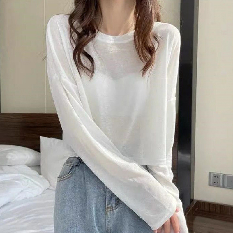 夏のアイスシルク長袖薄手ルーズホットガール日焼け止めカバーアップセーター女性のショートホワイトトップ空調シャツ