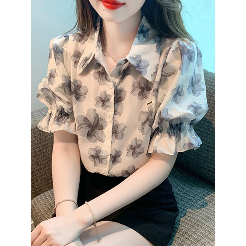 フランスの甘い水墨画の花のシャツの女性の夏の洋風の減齢のシフォンのシャツのゆったりしている泡の袖の薄い上着