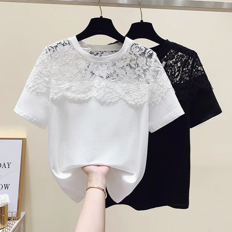 太った妹のtシャツレースのシャツ2025夏の新型の大衆の独特な小さいシャツはお腹の薄い半袖の上着の女性を遮ります。