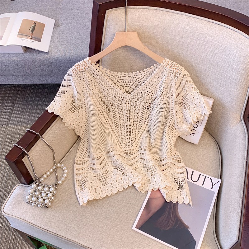 優しい風の透かし彫りvネックレースの女性服の夏の2025新型の薄いタイプの外は短いタイプの洋気の独特な小さいシャツを掛けます。
