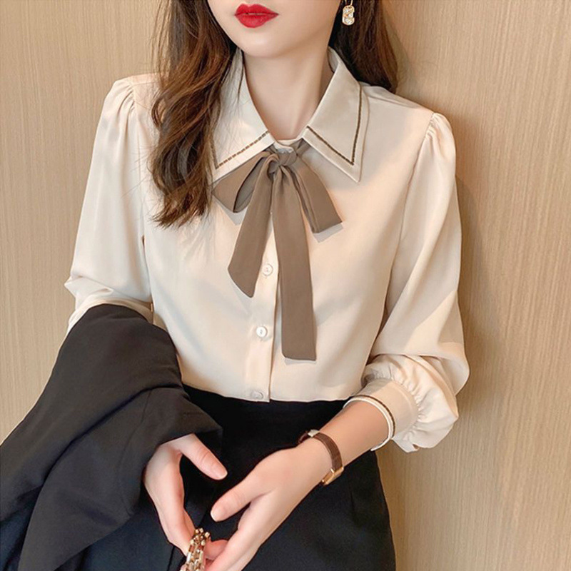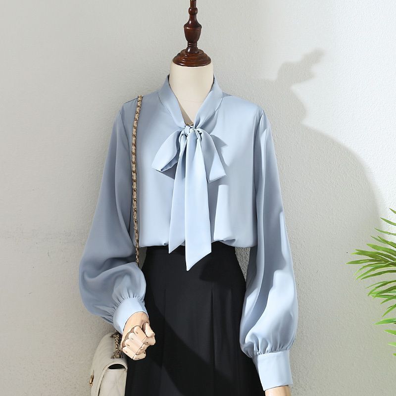 2025秋新作ブルーリボンサテンドレープシャツフェミニンランタンスリーブ通勤OL長袖トップス