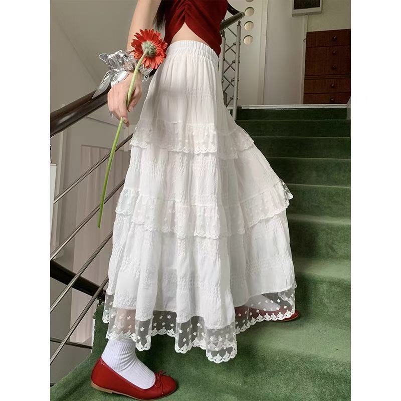 白いデザイン感のレースのケーキのスカートの半身のスカートの女性の春夏のハイウエストのフランスのロングスカートの大きいスカートのa字のスカート