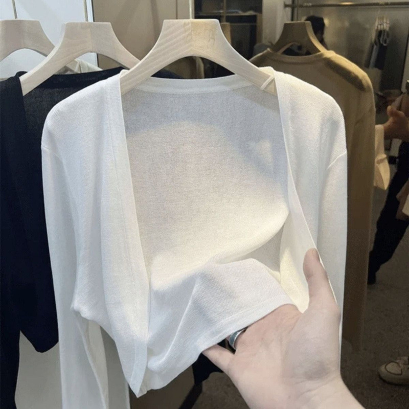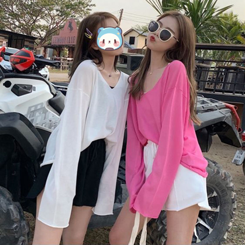夏のゆったりとしたレイジースタイルのわずかに透ける日焼け止めエアコンブラウス軽量アウタープルオーバーアイスシルクニットTシャツトップ女性用
