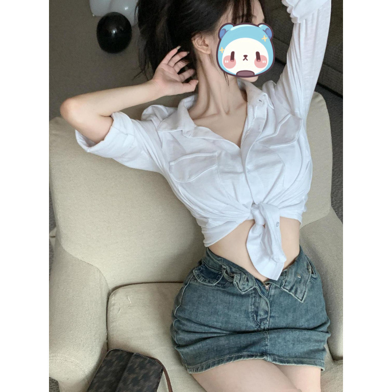 ホワイトポロカラーシャツ女性の夏のホットガールスリムストラップシャツ小柄なデザインニッチ長袖トップ