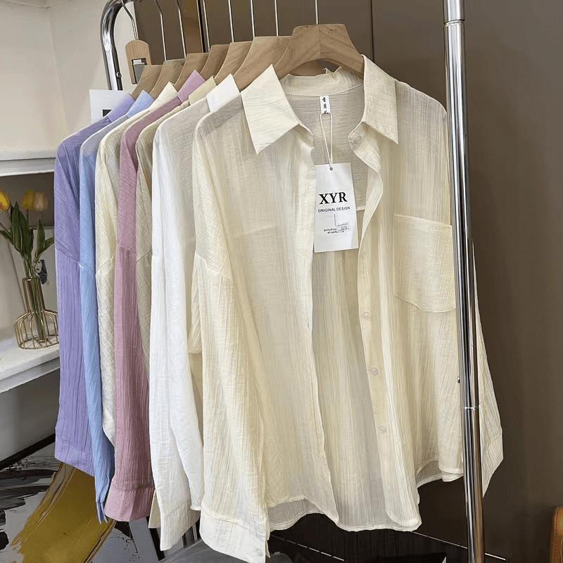 夏の薄いタイプの韓国系の純色のシャツの女性のゆったりとしたデザイン感があります。