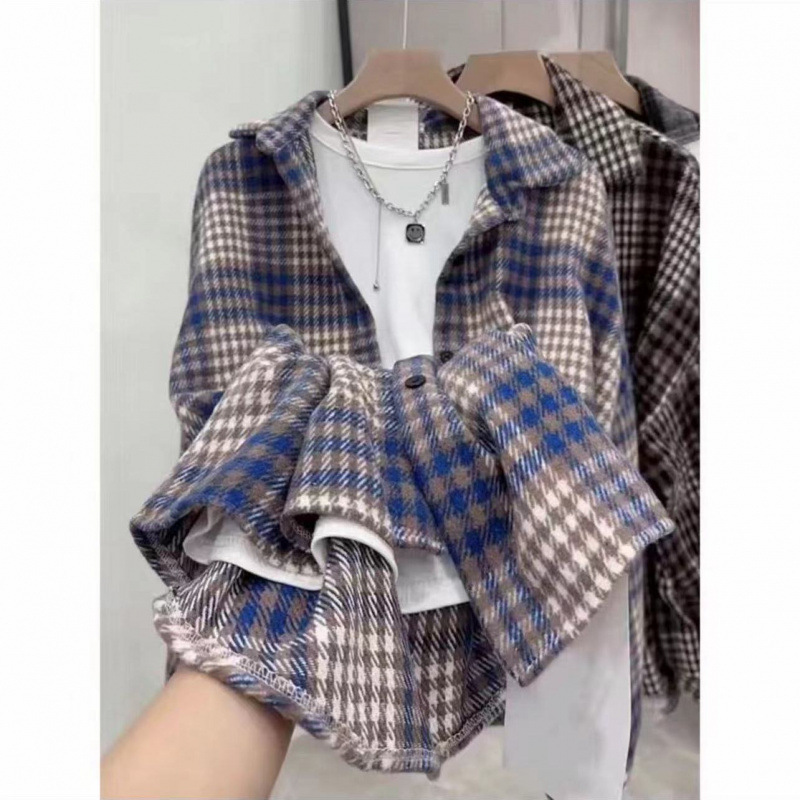 中长款衬衫女开衫外套磨毛格子衬衣女韩版宽松显瘦灯笼袖衬上衣女