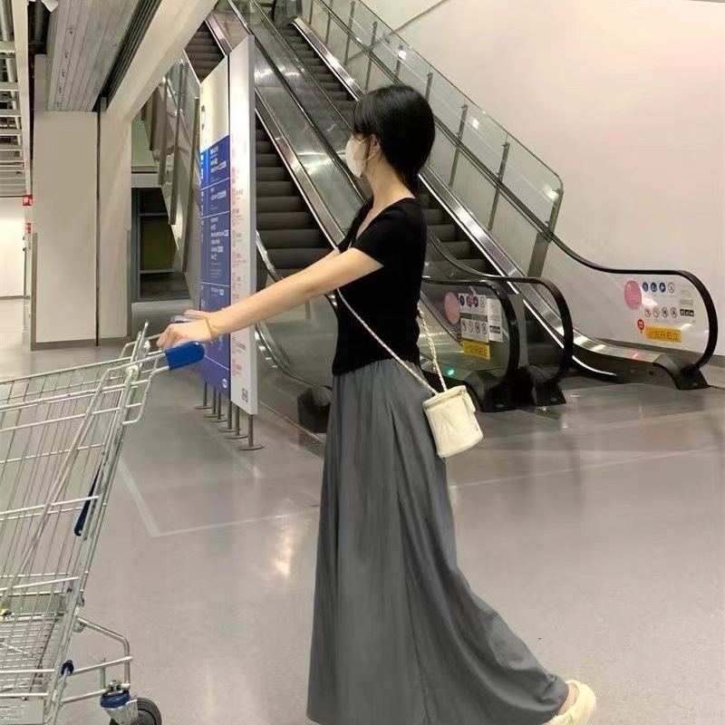 フレンチスタイル半袖ウエストマークTシャツトップス+ハイウエスト膝丈スカート レディース 夏 Aラインスカートセット 着痩せ効果