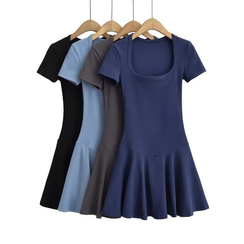 纯欲风U领短袖连衣裙女夏季辣妹性感修身显瘦外穿百褶迷你短裙子