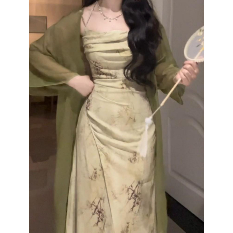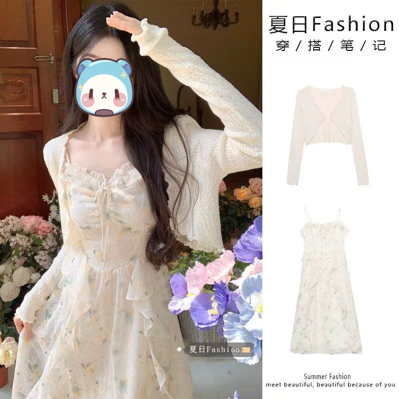 優しい風砕花ストラップワンピースセット女性2025春夏腰掛け首ロングスカート薄い日焼け止めカーディガン