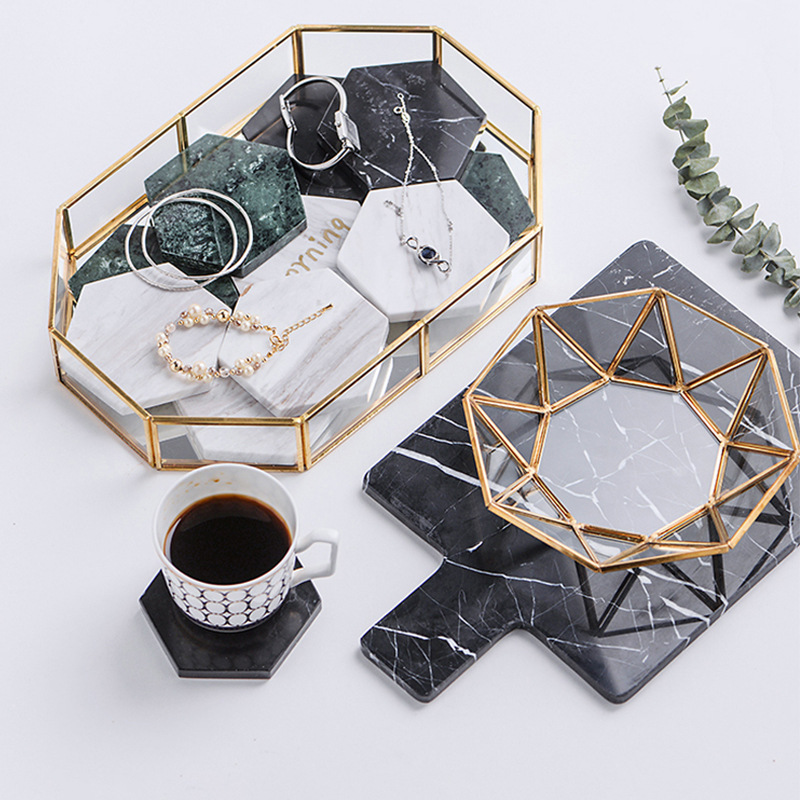 鏡面ガラス皿金色化粧ブラシ収納桶スキンケアデスクトップ復古多角形軽贅沢収納皿