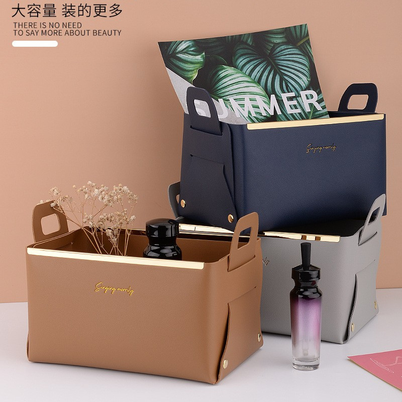 デスクトップ革収納ボックス折りたたみ可能整理ブルー持ち手スキンケア化粧品スナック雑貨収納カゴ置物