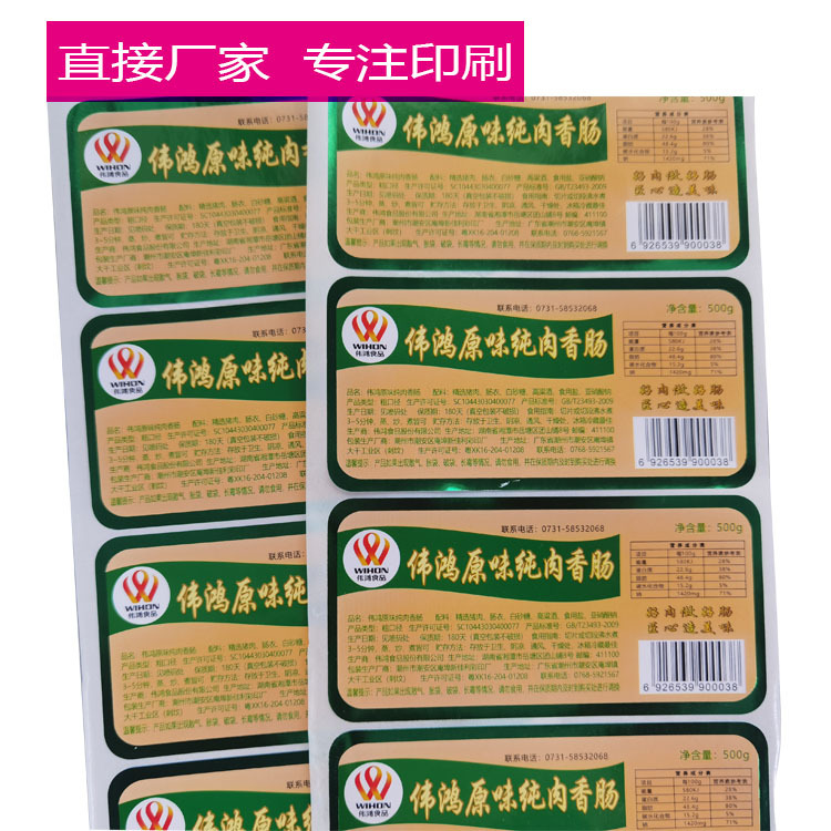 星沙不乾糊印刷工場は緑金合成材料を熱してロゴを作る熟食類の三防ラベルを貼る