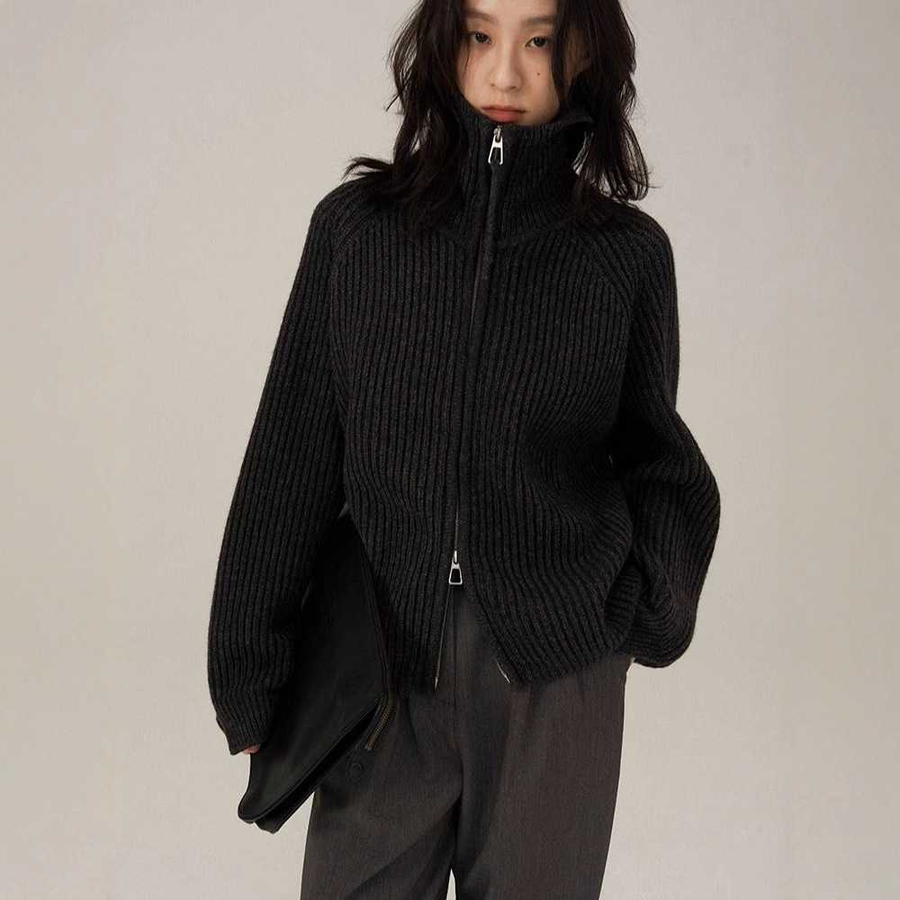 2025年秋冬新作韓国風レディースウールセーター、スタンドカラー長袖無地カシミヤ風ジップアップカーディガン