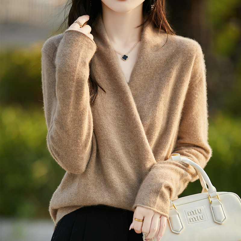 秋冬の新型100純ウールのセーターの女性vネックの百合の底のシャツはゆったりしていて、やせて見えるニットの洋風の全ウールのセーターです。