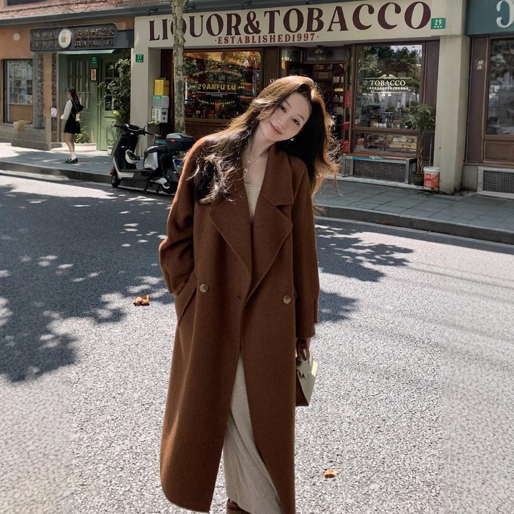 24秋冬の新型の両面は牛の絨毯のコートを消耗して、長い型のウールの感のゆったりしているスーツの毛のカシミヤのコートをプラスします。