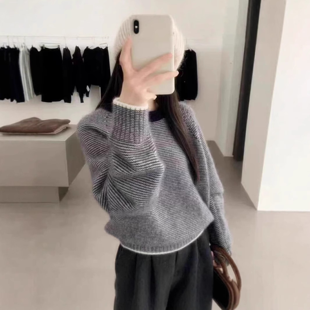 韓国版の怠惰なウールのセーターのゆったりした女性2024年秋冬のヨーロッパの商品の厚いカシミヤの丸首の純色の太い線のセーター