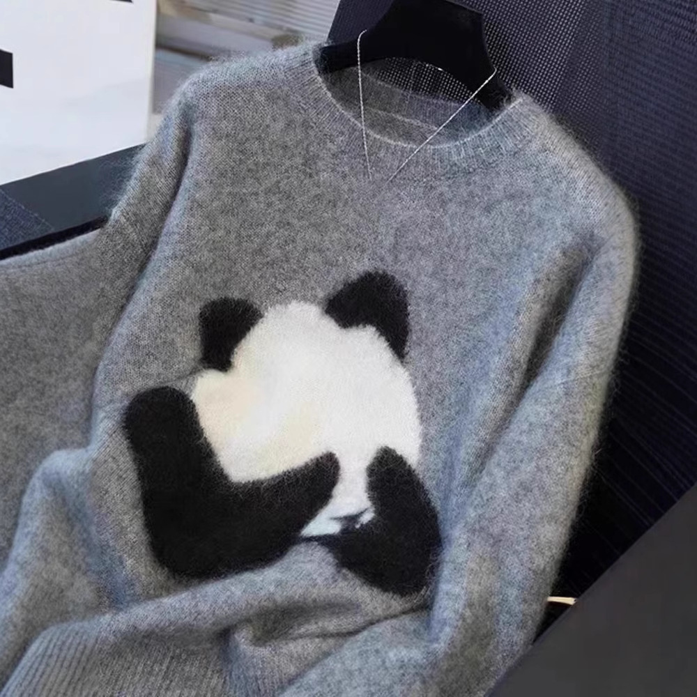 プルオーバーパンダ柄秋冬新作ラウンドネックウールセーター女性用ゆったり厚手セーター万能カジュアルニットインナー