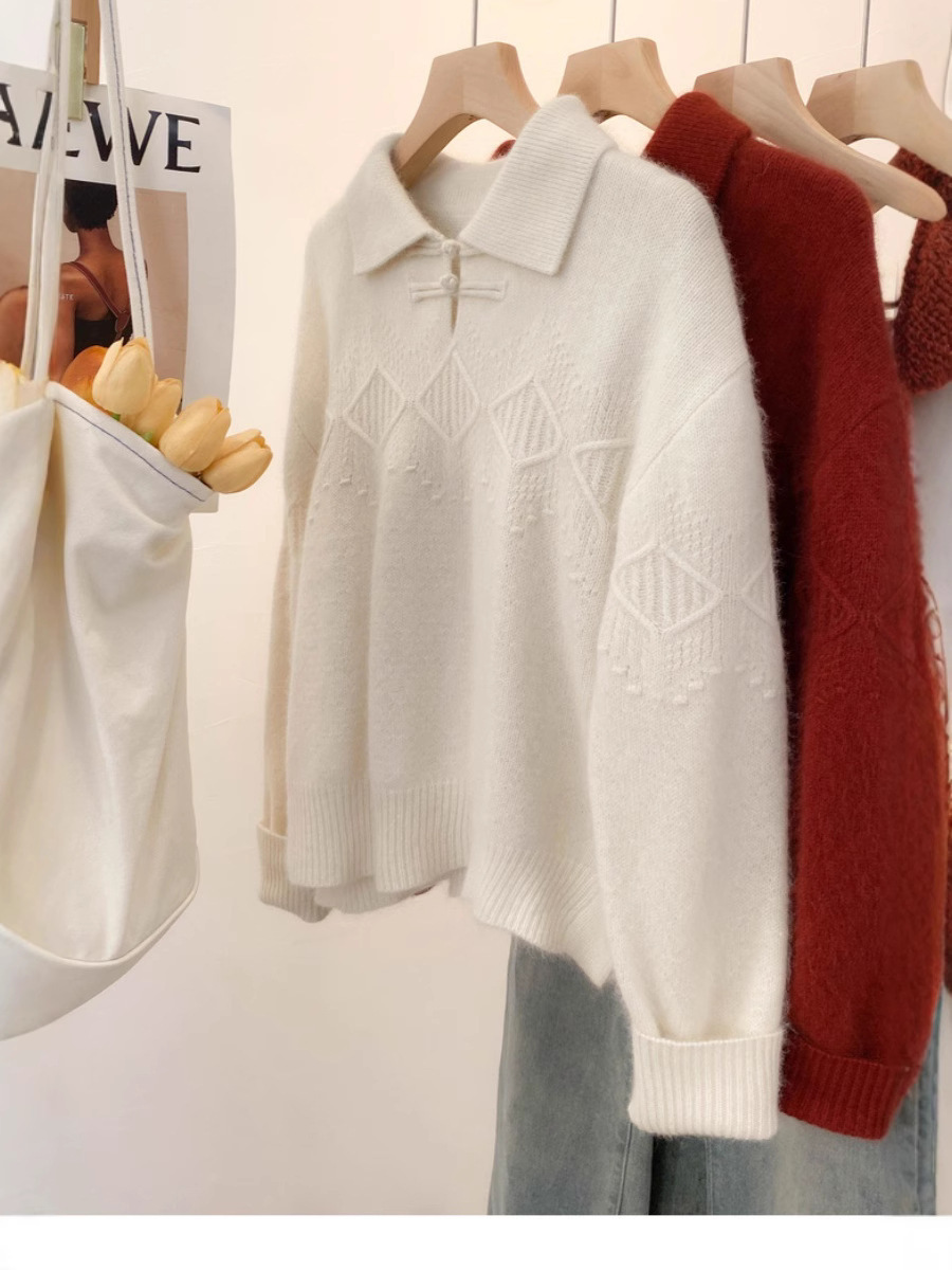 25秋冬新作中華風ポロ襟純毛セーター女性用デザイン性のあるゆったりとした厚手セーター外着用ソフトで柔らかいトップス