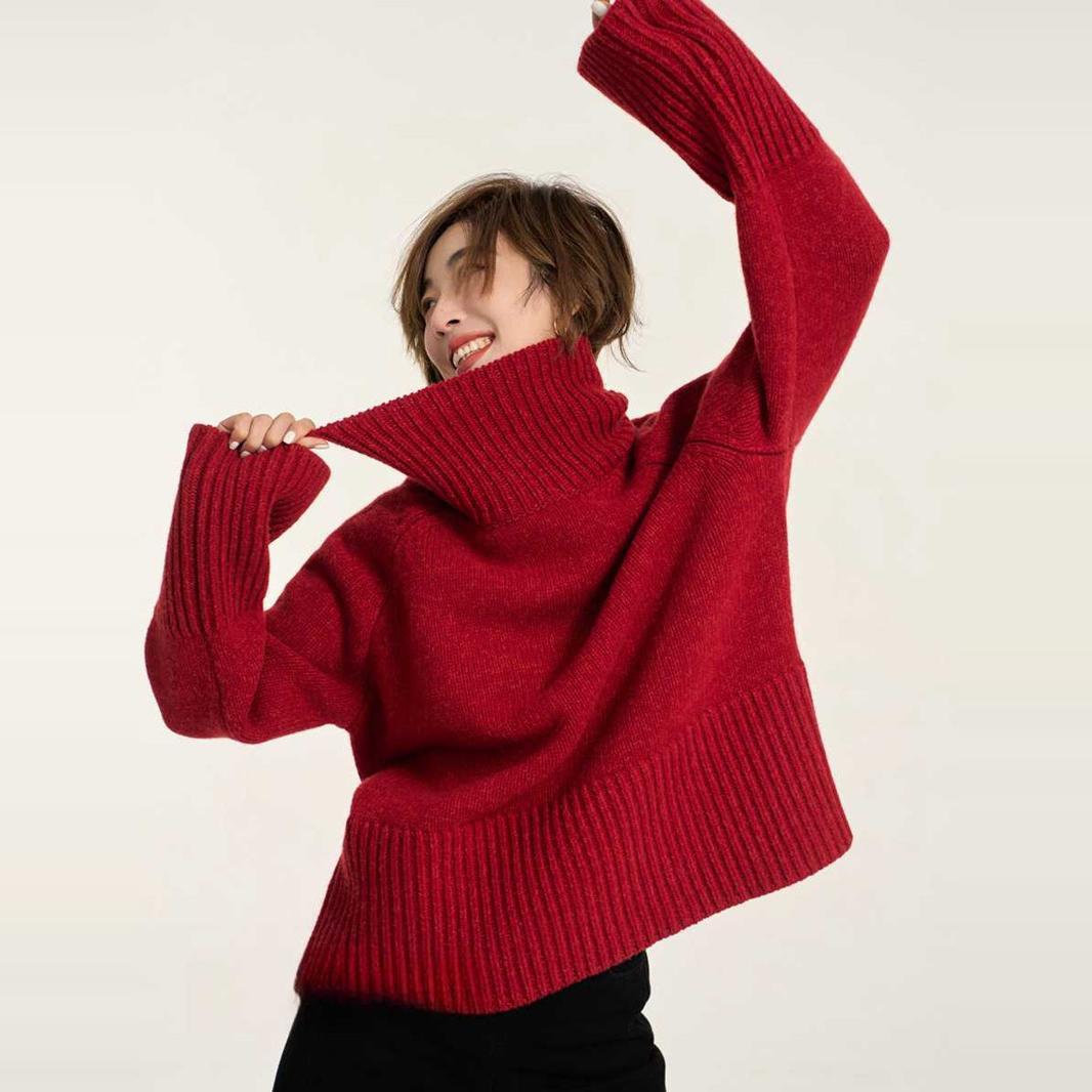 ほろ酔い赤いクリスマスの赤い新年のウールの高襟のカシミヤの女性はゆったりとしています。