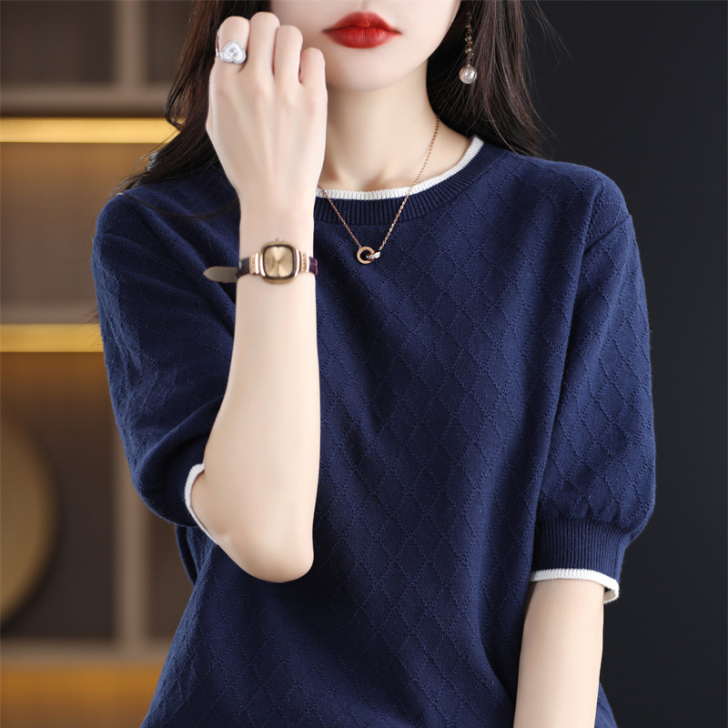 夏の新作の色合わせ綿ニット丸首半袖tシャツ女性ひし形百合純綿糸ゆったり半袖上着