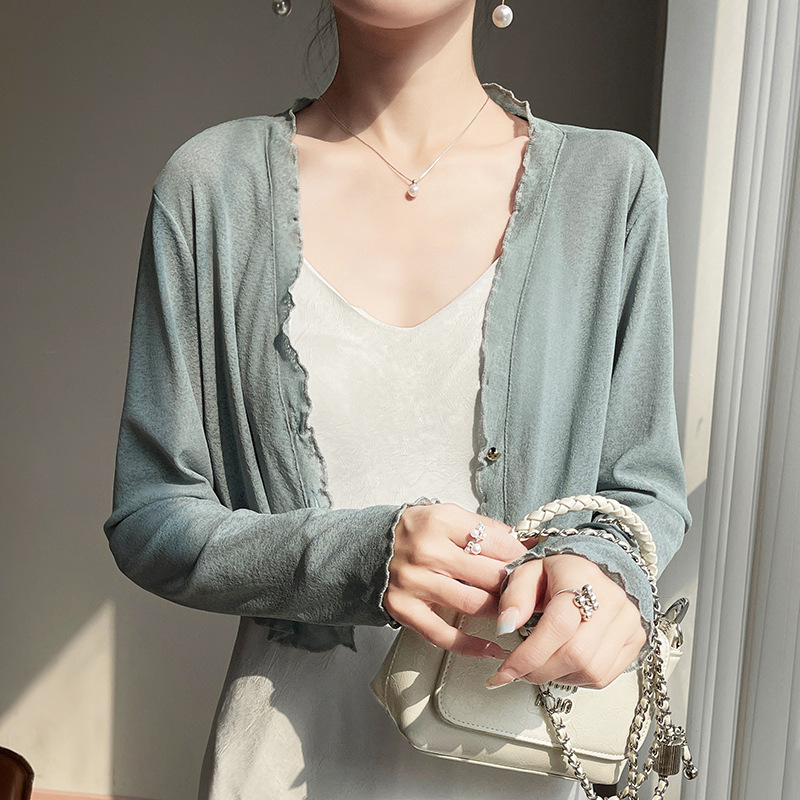 25年夏の新型vネック糸の木の耳元のカーディガンの女性の短い純色の薄いデザイン感のブラウスの日焼け止め服