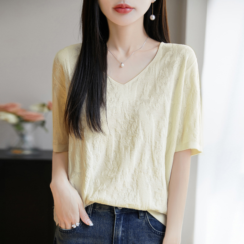 木目感vネックニット半袖tシャツ女性2025年春夏新純色ゆるいシャツ上着