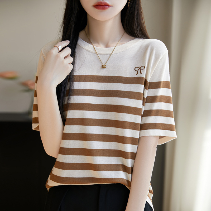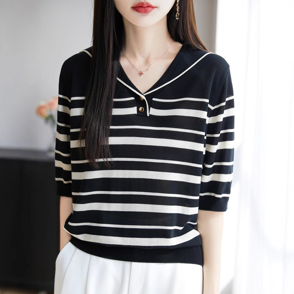 シンプルなコントラストストライプセーター春夏新作通気性テンセル五分袖ボトムレディースネイビーカラーTシャツ