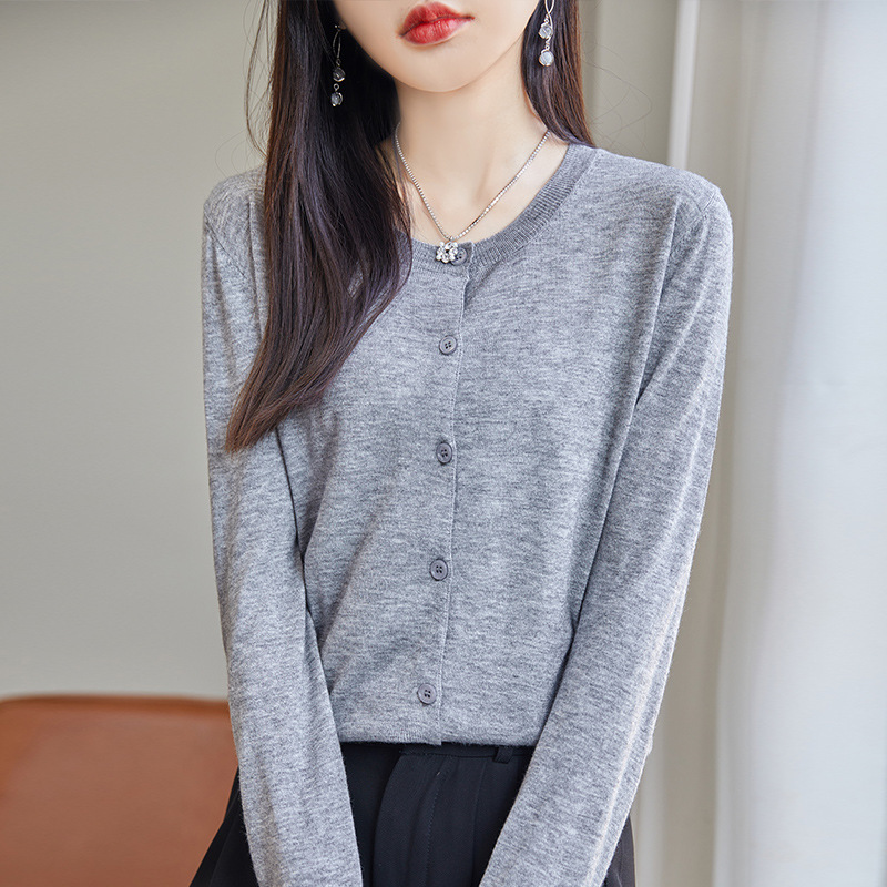 2025年春夏新作精紡シルクウール丸首ニットカーディガン長袖女性純色ゆったり上着コート