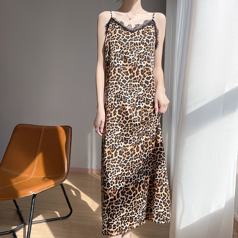 セクシーなホットガールスタイルヒョウ柄レース薄いサスペンダードレスレディースVネック通気性バックレス調節可能なストラップロングスカート