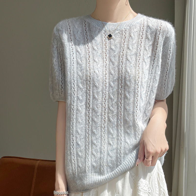 カシミヤマルベリーシルク混ラウンドネックセーター半袖レディース24夏新作中空かぎ針編みトップ