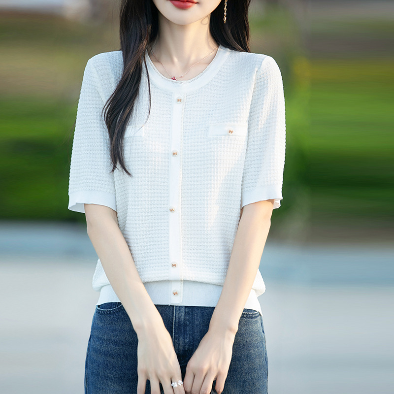 2025年春夏新作小香風氷糸丸首ニット半袖色合わせ偽カーディガン