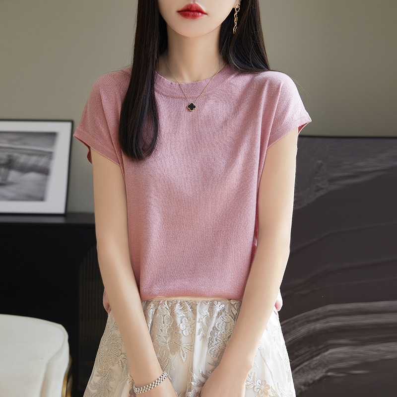 2025年春夏新作シルクウール丸首ニット半袖tシャツ女性純色プルオーバー