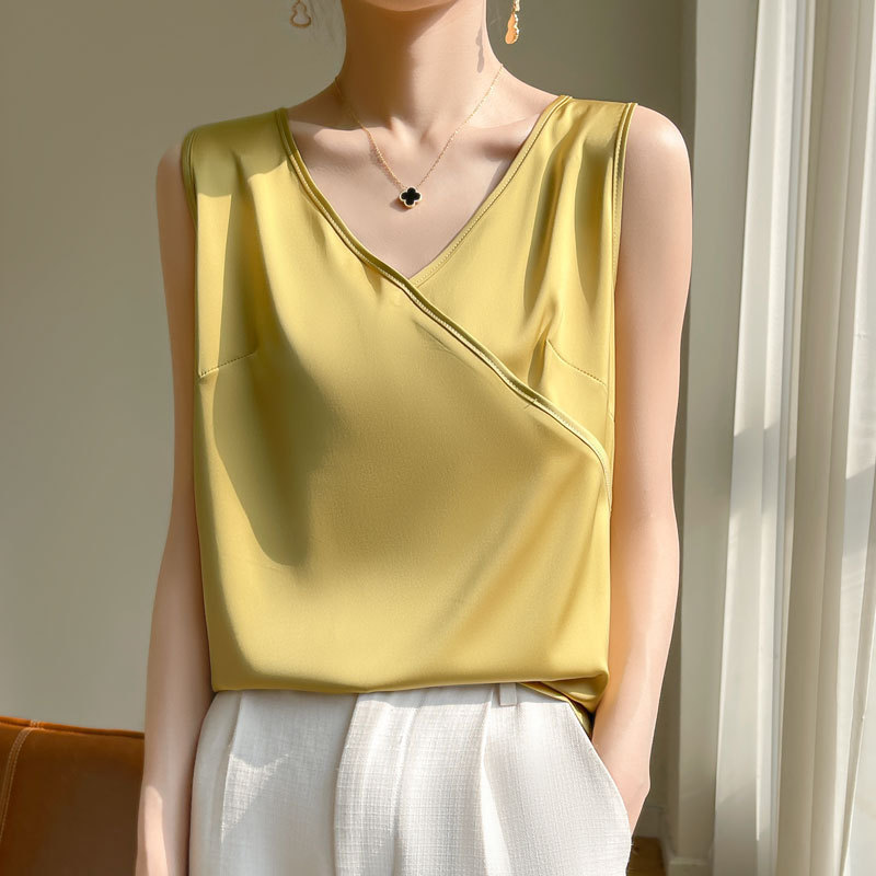 通気性、軽量、シルキーなサテンニットノースリーブベスト、エスニックスタイルの斜め前立てデザイン、レディースVネックサスペンダー