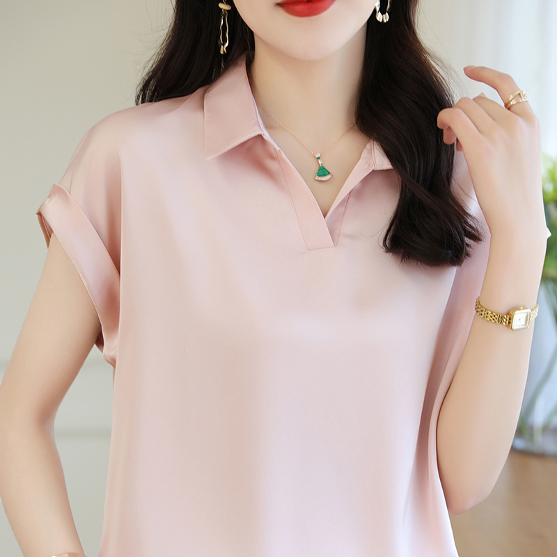2025 春夏新シルキーサテンポロカラーシャツ小さなフライングスリーブ半袖女性の無地ルーズプルオーバーシャツ