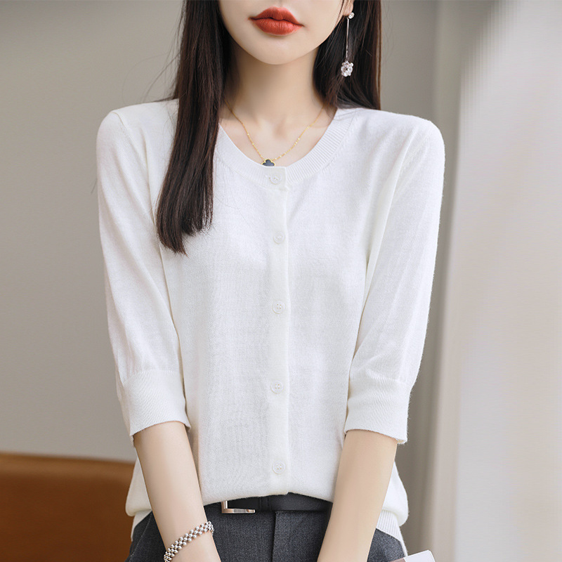 2025年春夏新作精紡シルクウール丸首ニットカーディガン五分袖女性純色ゆったり上着