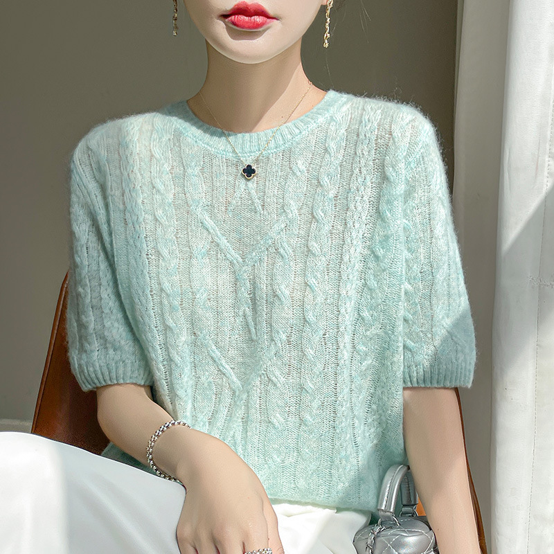 24 新しい夏のカシミヤとマルベリーシルクブレンドラウンドネックセーター半袖レディースツイストソリッドカラーオールマッチングトップ
