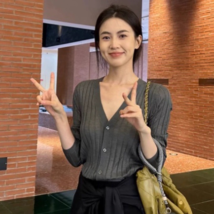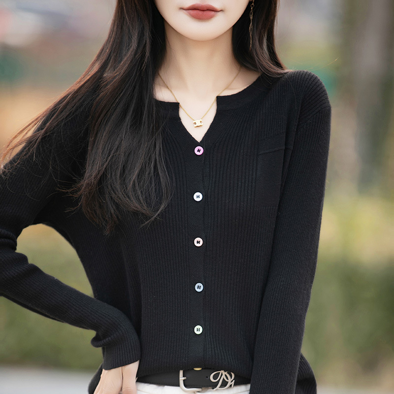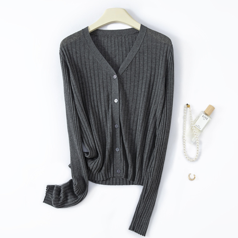春夏新作韓国版v字襟縦坑条純色系ボタン精紡毛ウール修身痩せ女性メリヤスカーディガン