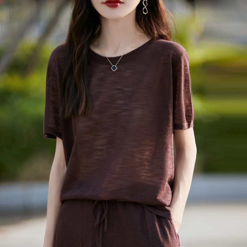 春夏新作通気性軽薄感竹节麻レディースニット半袖シンプル丸首三分袖正肩tシャツ