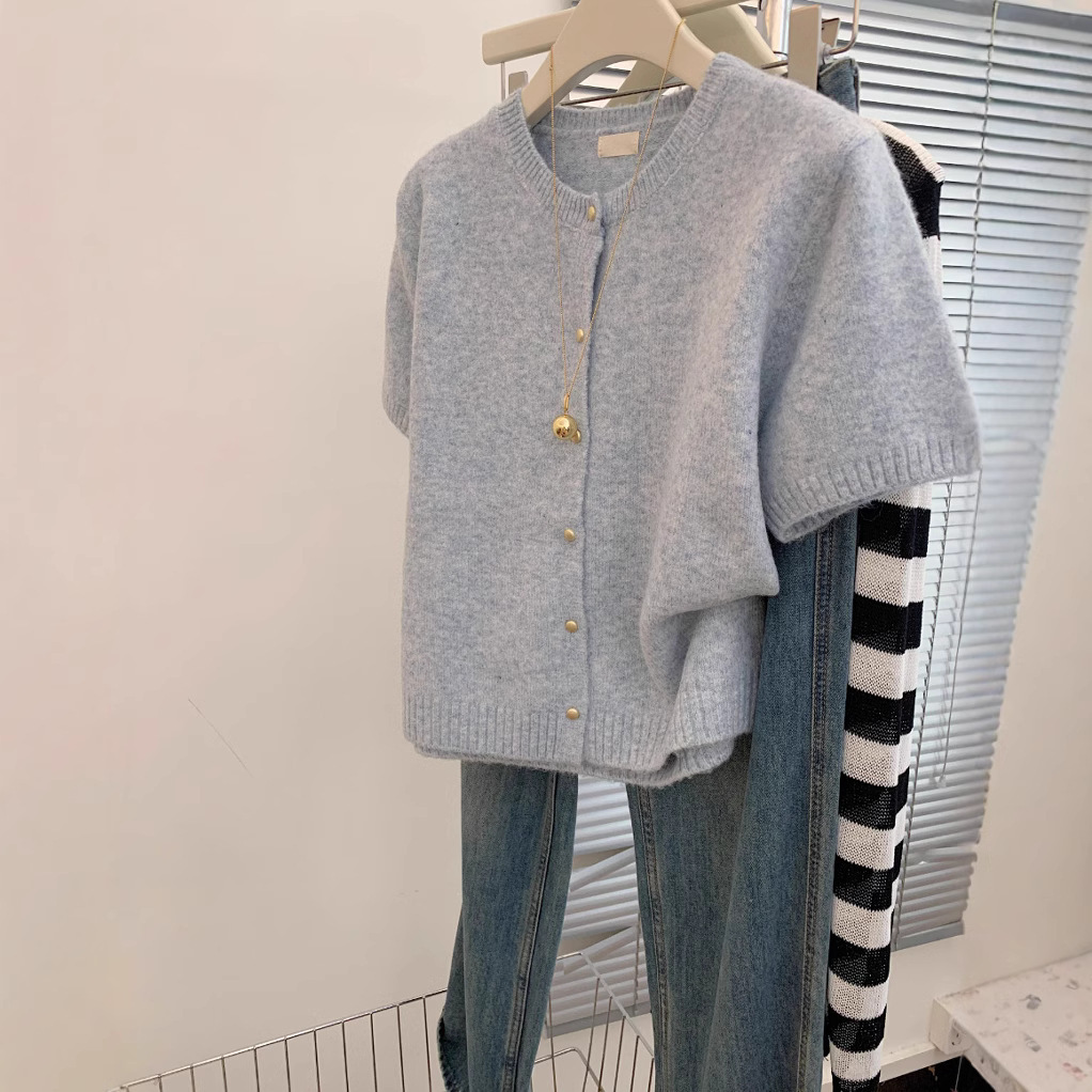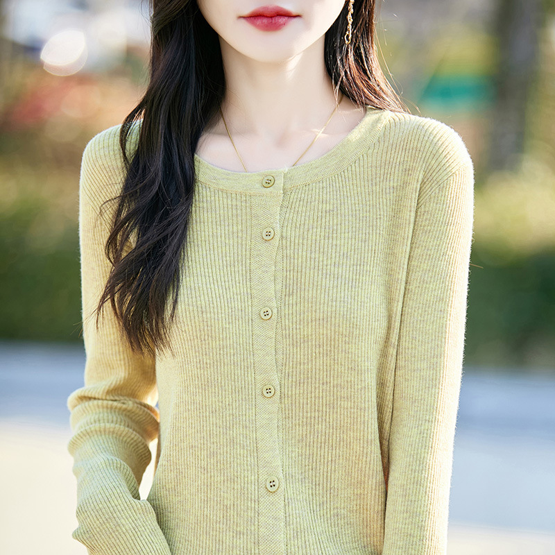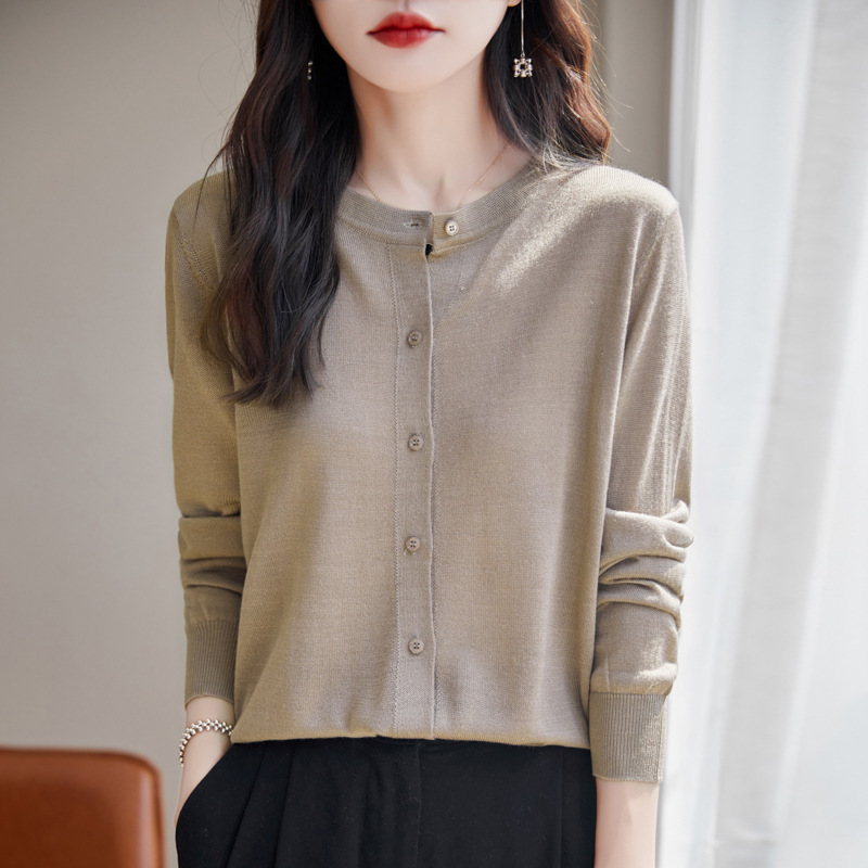 25年新型精紡天糸ニットカーディガン純色シンプル丸首単列ボタン女性通気性薄いエアコンシャツ