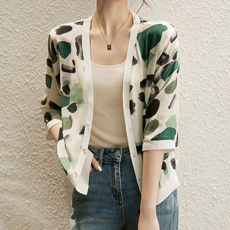 Vネックの単列ボタンの夏の薄いタイプの7分の袖の外はシルクの滑らかでしなやかな全身のプリントの設計の日焼け止めのエアコンのブラウスを掛けます。