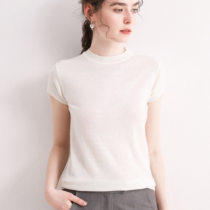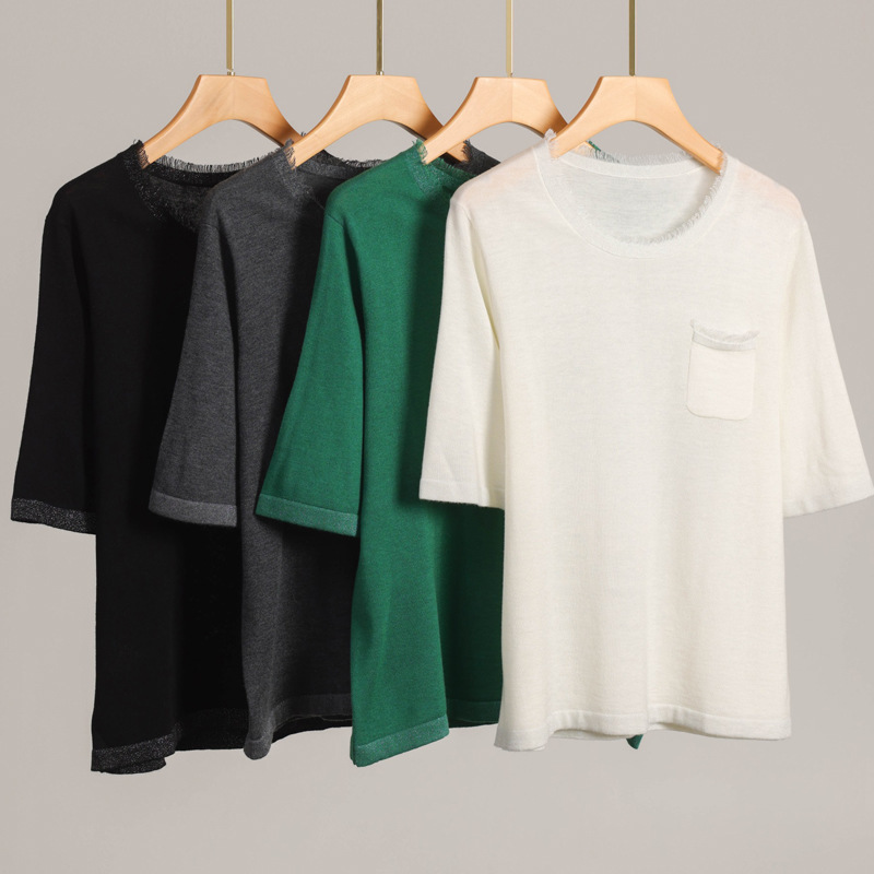 薄い通気感のある丸首の女性の精紡の毛の辺の半袖の25年の春夏の新型の5分の袖のtシャツの潮