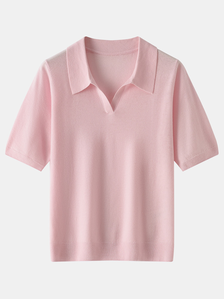 純色vネック女性半袖2025新型夏の薄い肩のスリムウールpoloシャツの短い上着
