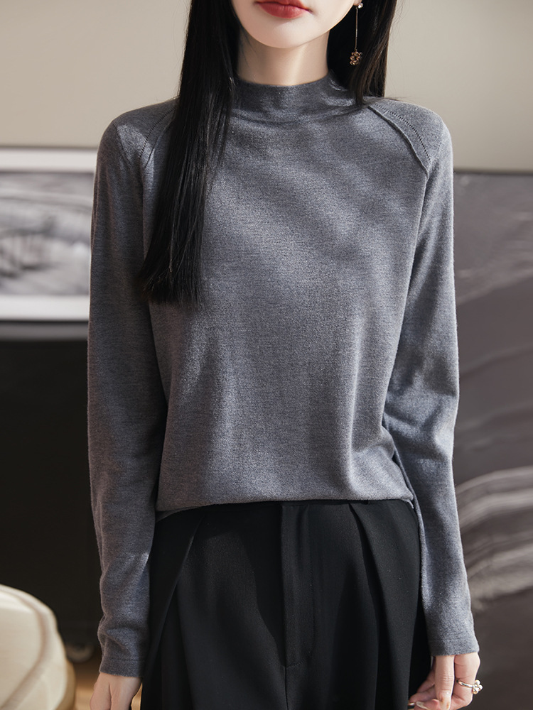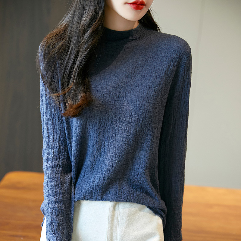 2025年春の新商品のウールの半高襟のニットの立体のしわの長袖の純色の頭の底のシャツ