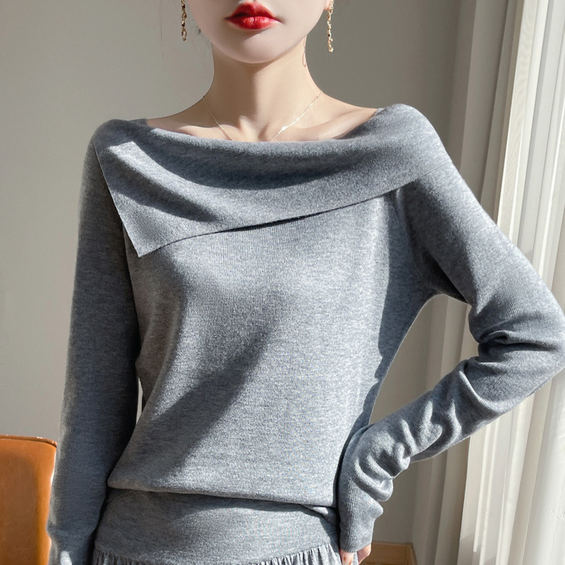 2025年の春の新型のフランス式の優しい気質の精紡のウールの1字の襟の長袖のニットの不規則な上着