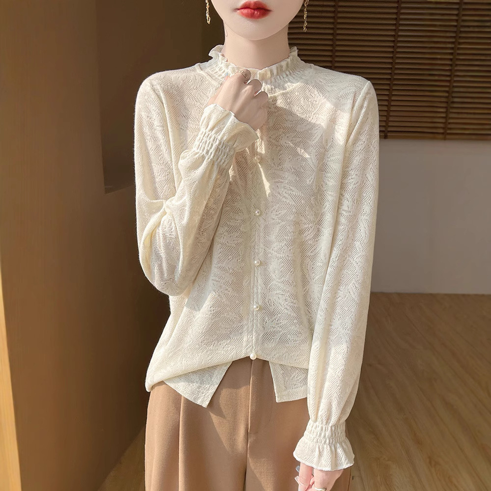 春夏の新商品のウールの半高襟の薄い金の透かし彫りの上着のフランスの木の耳元の設計の女性の頭をかぶせて底を打ちます。
