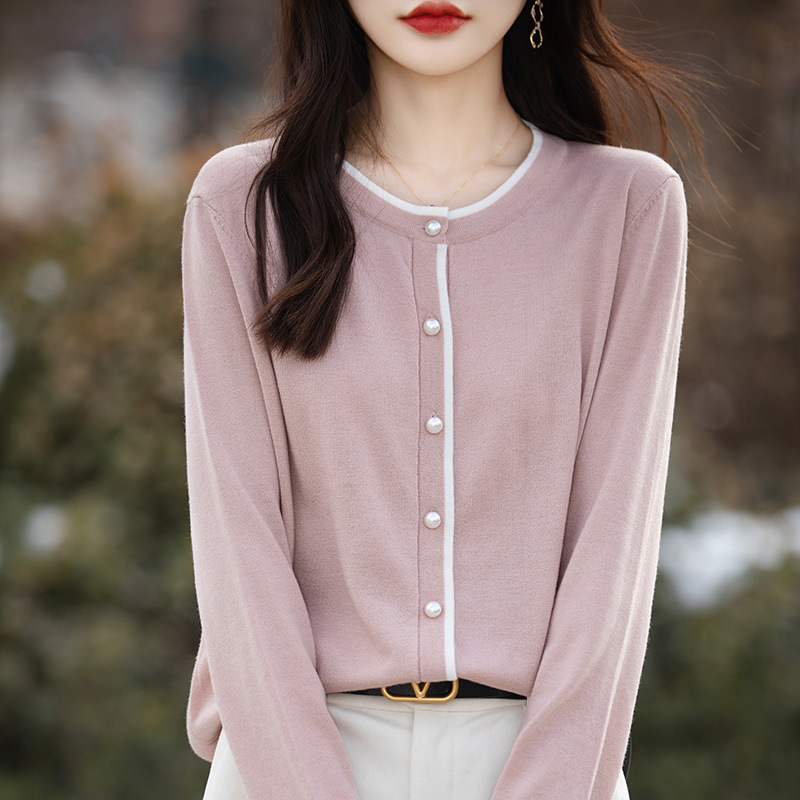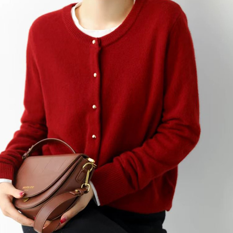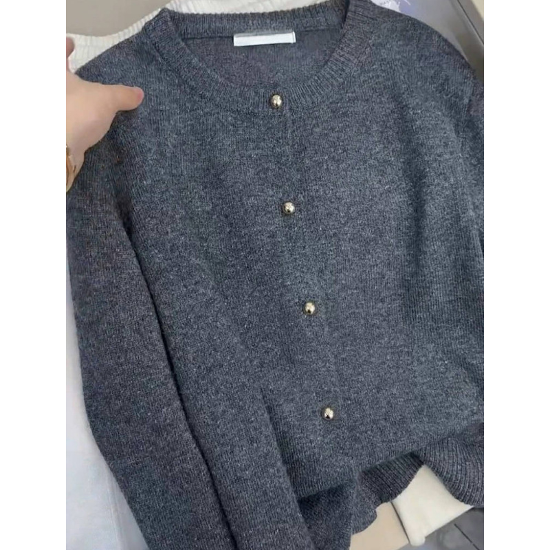 24年早秋の新商品精紡ウール丸首ニットカーディガンの真珠ボタンの色合わせの優しい雰囲気のデザイン感の上着