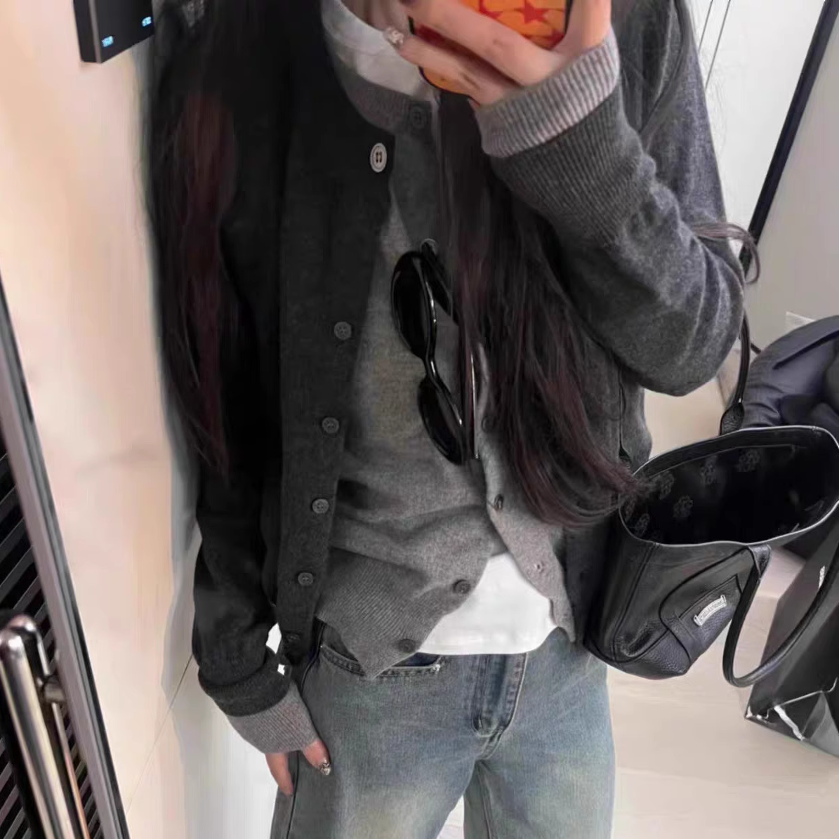 ファッション百合丸首100純ウールニットカーディガン女性春秋ゆるい灰色セーター短いカシミヤコート