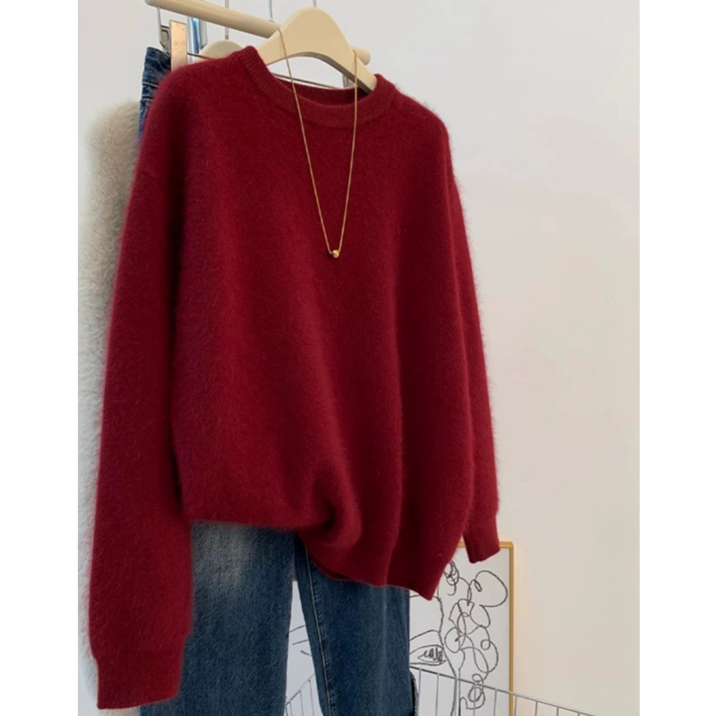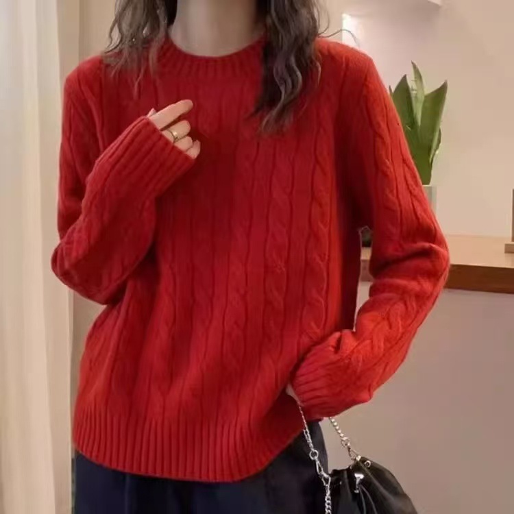 新年の赤い気質の丸首のカシミヤのニットの女性の秋冬の頭をかぶせて厚いセーターのゆったりしているウールの底の上着を作ります。